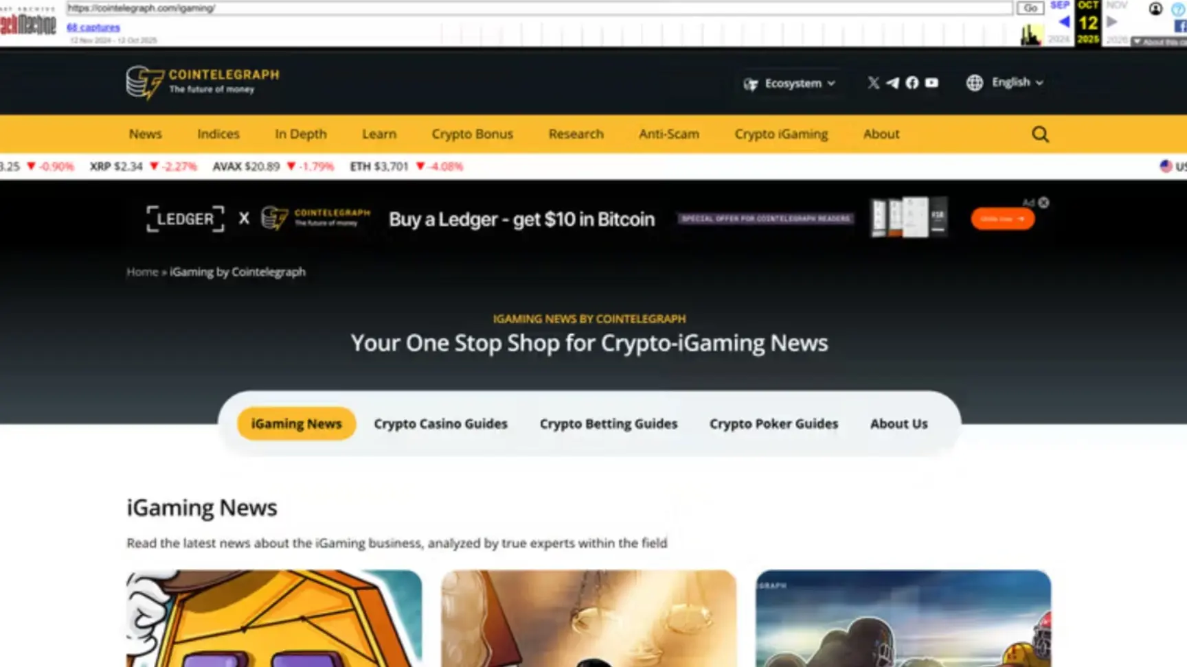 Archived snapshots show that Cointelegraph removed its entire iGaming directory between October 7 and October 12. Pages offering gambling guides, casino app reviews and betting-related content, formerly part of the iGaming section, returned 404 errors.